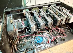 Восемь видеокарт RTX 3070Ti (на снимке семь, у восьмой сломался кулерный блок и я утащил видяшку в ремонт). Всё это сводится в одну мамку. Майнерам известно, что завести даже четыре видяшки на некоторых материнских платах проблематично (а то и невозможно, в силу проектных ограничений). Тут - восемь; пришлось попотеть, но по итогу всё установилось.